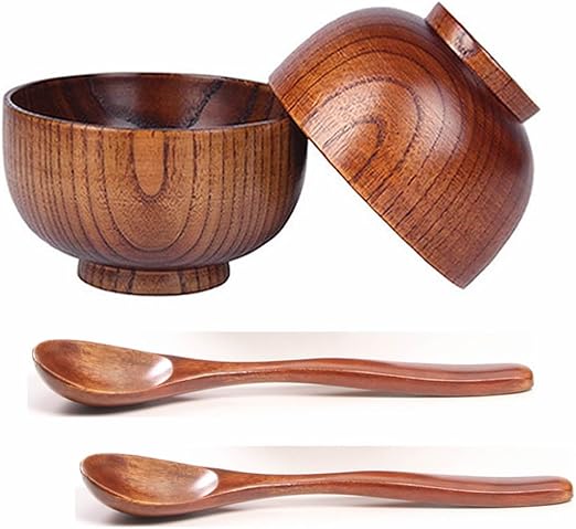 Amazon Com Oryougo 4 Pieces Wooden Handmade Bowl And Spoon For For Rice Miso Serving Home Kitchen Tableware Kitchen Dining